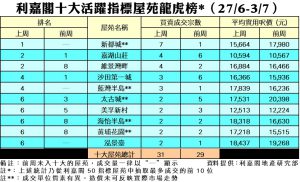 利嘉閣地產董事陳大偉表示,業主普遍看好樓市前景,不肯向買家妥協減價售樓,雙方拉鋸嚴重,致使十大屋苑成交於低位水平橫行。綜合利嘉閣地產分行數據所得,全港十大活躍指標屋苑在上周(27/6–3/7)錄31宗買賣個案,較前周(20/6–26/6)的29宗按周上升7%,每個屋苑平均錄約3宗成交。