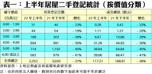 按居屋價格劃分,上半年所有價格組別登記量按半年均錄得跌幅,當中價值600萬元或以上的「貴價」買賣登記,由去年下半年的979宗急瀉41%至今年上半年的582宗,跌幅最為顯著。至於最多登記的價值500萬元至599萬元組別錄得714宗登記,涉及38.84億元,按半年量值均錄得40%跌幅。