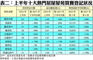從屋苑層面分析,上半年十大活躍成交屋苑中,共有8個屋苑買賣登記量報跌,跌幅介乎3%至55%不等,其中天水圍天盛苑跌幅最大,屋苑期內錄得39宗買賣登記,成交總值約1.87億元,較去年下半年同樣大減55%。而今年上半年登記最活躍屋苑為九龍灣麗晶花園,共錄63宗成交,總值涉及3.49億元,量值按半年分別下跌13%及16%。