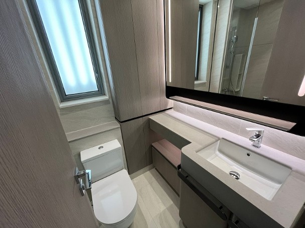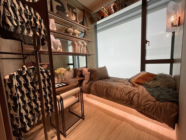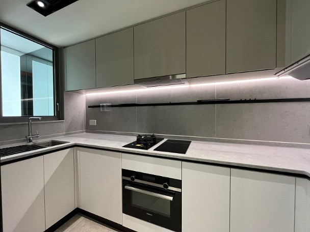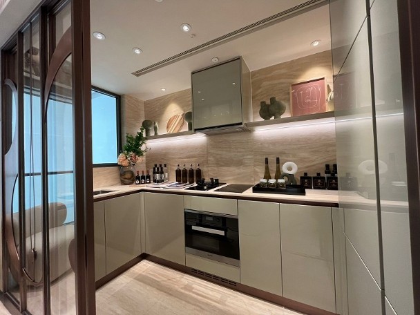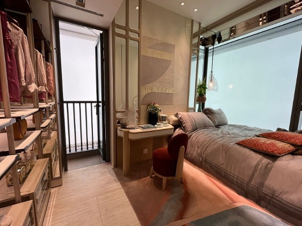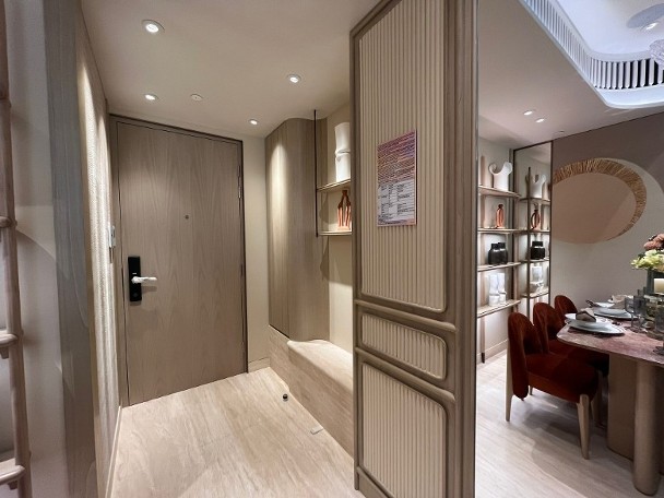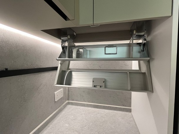 發展商同時開放上述原則的無改動示範單位,可見原則的間隔,以及玄關和走廊均附有收納櫃,另廚房內置升降吊架。