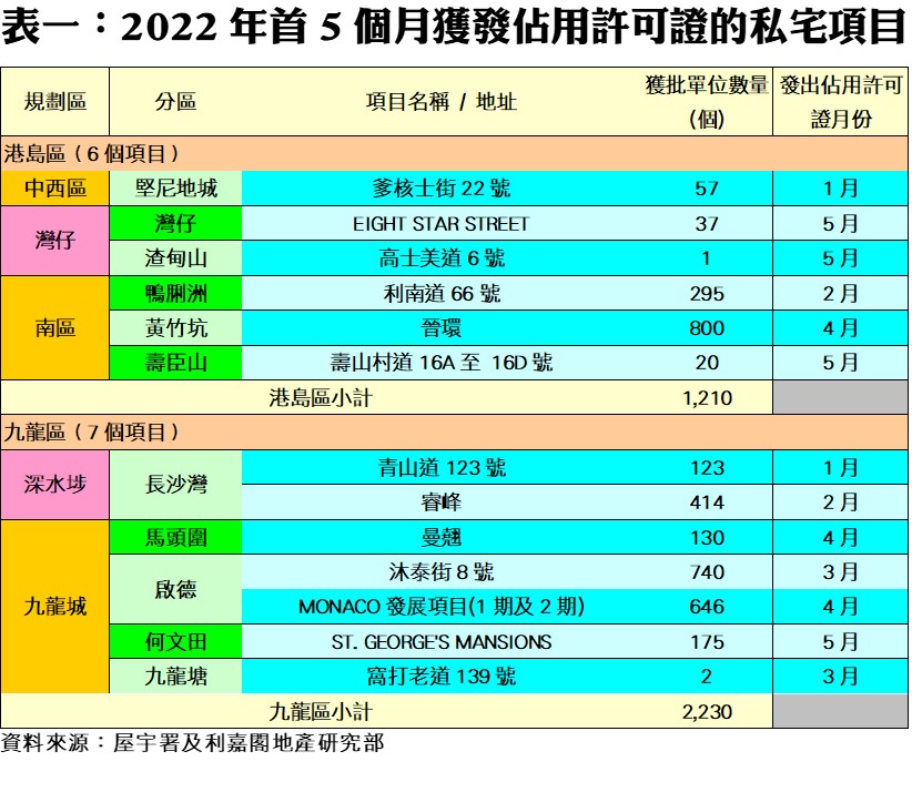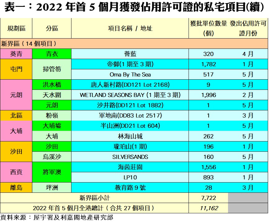 利嘉閣地產研究部主管陳海潮表示,根據屋宇署今天最新發表的資料月報顯示,2022年五月份全港共有10個項目,共1,183個私人住宅單位落成(以屋宇署發出佔用許可證的樓宇數量為準),較四月份的1,896伙下跌38%。不過,今年首5個月合共27個項目、涉及11,162伙私宅落成,較去年同期的7,791伙按年增加43%,是自2002年以來的二十一年同期最多。