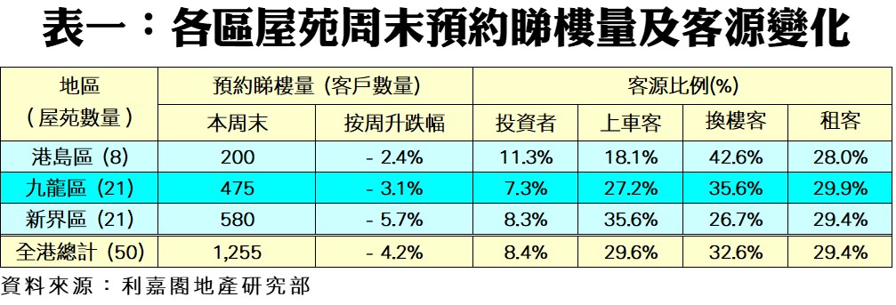 利嘉閣地產研究部主管陳海潮表示,儘管近日普遍業主態度明顯軟化,減價情況陸續增加,吸引買家出動睇盤「撈貨」,但普遍資金傾向觀望下周美國聯儲局議息會議,市場估計將加息3/4厘甚或1厘。根據利嘉閣地產研究部數據估算,全港50個指標屋苑共錄1,255組客戶於周末預約睇樓,按周大減4.2%。新盤低開盡吸市場焦點,加上疫情持續升溫,部分買家暫緩睇樓活動。
