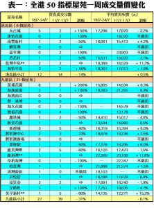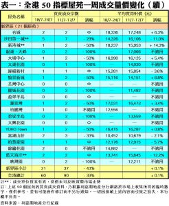 至於,港島區8個指標屋苑上周共錄12宗交投,較前周的14宗減少2宗或14%,其中南豐新村及杏花村各錄1宗買賣,分別按周減少50%;康怡花園、鯉景灣及嘉亨灣期內暫未錄得成交,齊齊「捧蛋」。此外,在全港50個指標屋苑當中,上周共有17個屋苑錄得「零成交」,較前周的10個增加70%,當中港島區佔3個;九龍區佔6個,而新界區則佔8個屋苑(詳見表一)。