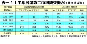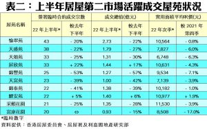 陳海潮指出,由於美國加息步伐轉急,下半年本港供樓利率上行壓力驟增,料部分買家減慢入市步伐靜觀其變,加上預期年內還有不少低門檻上車新盤登場,料會吸走部分居二客源。再者,最快到年底新一批「白居二」購買力才開始入市,即下半年有較長時間為真空期,故初步估計,下半年居二交投或再減少兩成半,至約600宗水平,而平均成交樓價料轉平穩。