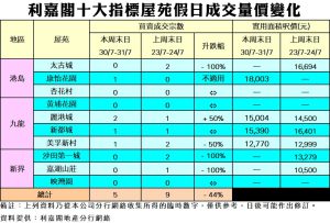 《利嘉閣十大指標屋苑假日二手實況》 一手新盤吸納客源 二手市場陷拉鋸局面 十大屋苑周末成交5宗跌44% 連續8周個位數