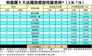 利嘉閣地產董事陳大偉表示,新盤持續吸睛搶客,加上二手筍盤早前已被迅速消化,買賣拉鋸情況重現,致使十大屋苑成交停滯不前。綜合利嘉閣地產分行數據所得,全港十大活躍指標屋苑在上周(1/8–7/8)錄35宗買賣個案,較前周(25/7–31/7)的38宗按周減少8%,每個屋苑平均錄3至4宗成交。