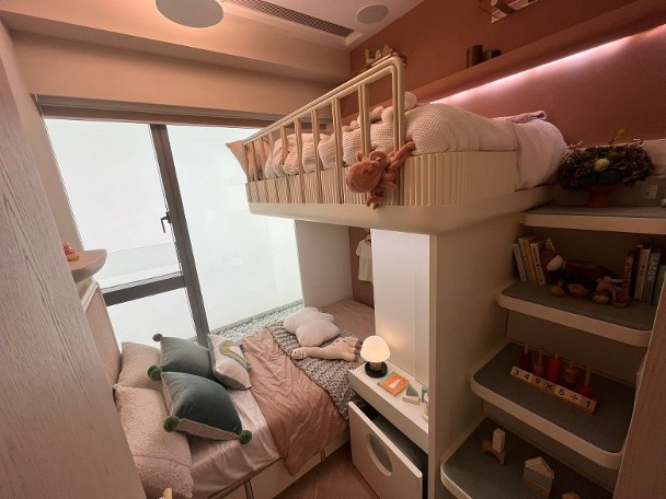 設計師將其中一個睡房配置成工作間,設置單人壁床。另一間睡房打造成兒童房,而主人睡房連接浴室及工作平台。