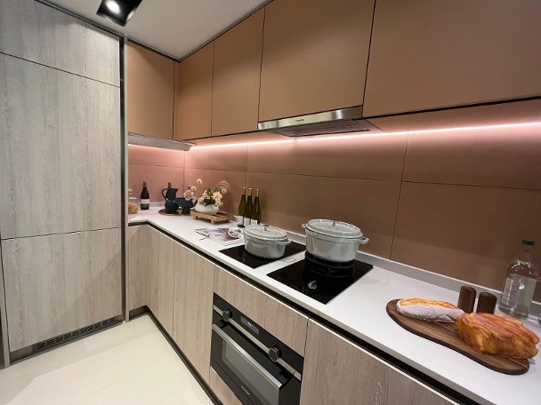 該單位以「北歐花映綠洲」為設計主題,用淺綠色及珊瑚粉色為主調作布置,客廳備有落地玻璃趟門連接露台。開放式廚房連玻璃趟門設計,可阻隔油煙。