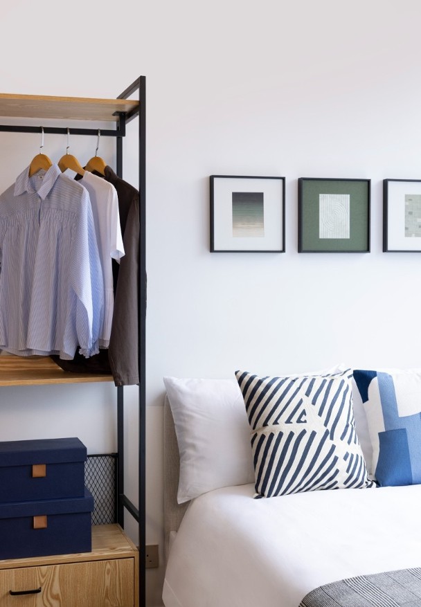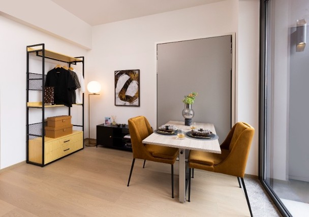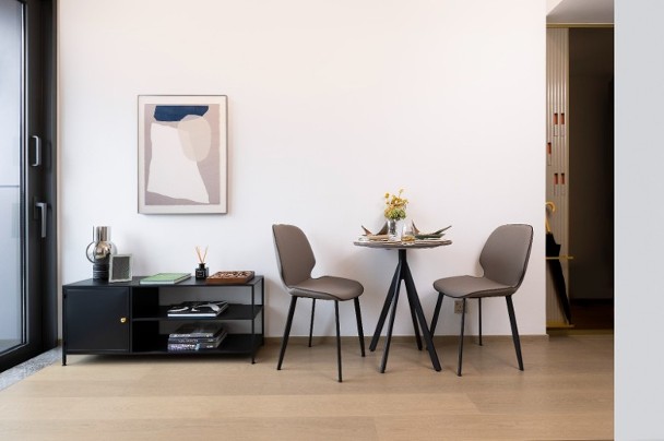 上述單位以簡約北歐風格為基調,樓層與樓層之間的高度為3.15米,大門玄關位置均設有鞋櫃、多功能特色牆及全身鏡。客飯廳連接22方呎露台。