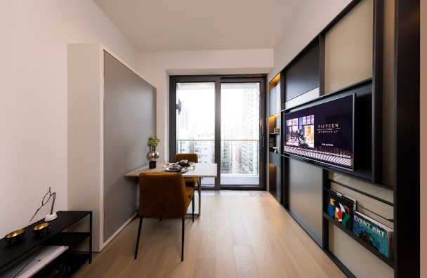 另一伙示範戶為25樓C室,採開放式間隔,實用面積213方呎。單位配備量身訂製變形家具,可作為書桌及睡床兩用。截止昨日,該盤累售84伙,佔全盤104伙逾80%,平均成交呎價近31,000元,套現約8.5億元。