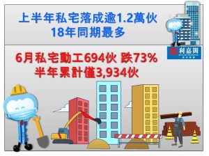 六月份私宅落成量902伙 按月減少24% 上半年逾1.2萬伙落成 十八年同期新高