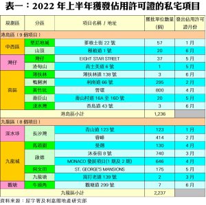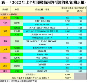 陳海潮指出,今年上半年落成量已達差估署全年預測約22,850伙的近53%,進度與預期相符,而預計年內仍有不少大型項目將可取得入伙紙,包括火炭「星凱‧堤岸」(1,335伙)、啟德「維港1號」(1,059)、元朗「THE YOHO HUB」(1,030伙)、大圍「柏傲莊I」(783伙)等,再加上其他中小型項目,初步估計2022年全年落成量可重上兩萬伙以上,並有機會達到政府全年預測。