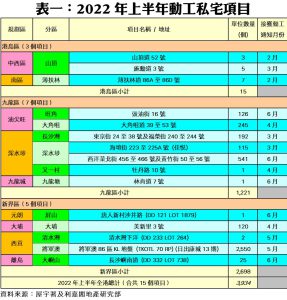 連同上述項目,2022年上半年全港共有15個私宅項目動工,涉及單位總數3,934伙。當中以新界區的施工單位數量最多,涉及5個項目合共2,698伙,單位佔整體比例約68.6%;九龍區有7個私宅項目動工,單位數量1,221伙,佔整體比率約31%;港島區則有3個項目、合共15個單位動工,佔整體比例約0.4%。