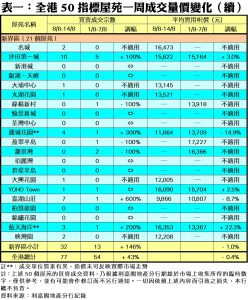 至於九龍區方面,21個指標屋苑上周共錄33宗成交,較前周的32宗僅微升3%,升幅較另外兩區遜色。其中新都城升幅最為明顯,由前周3宗急增2倍或6宗至上周9宗,表現遙遙領先;緊隨其後的將軍澳廣場及都會駅,上周均各錄得3宗成交,宗數分別增加2宗及3宗。匯景花園、將軍澳中心及昇悅居各自錄得2宗成交,按周增加1倍。此外,在全港50個指標屋苑當中,上周共有19個屋苑錄得「零成交」,較前周的24個減少約21%,當中港島區佔2個;九龍區佔6個,而新界區則佔11個屋苑(詳見表一)。
