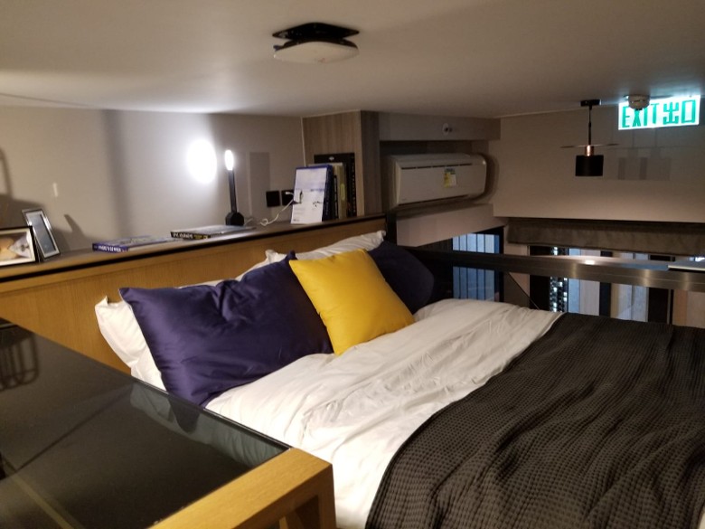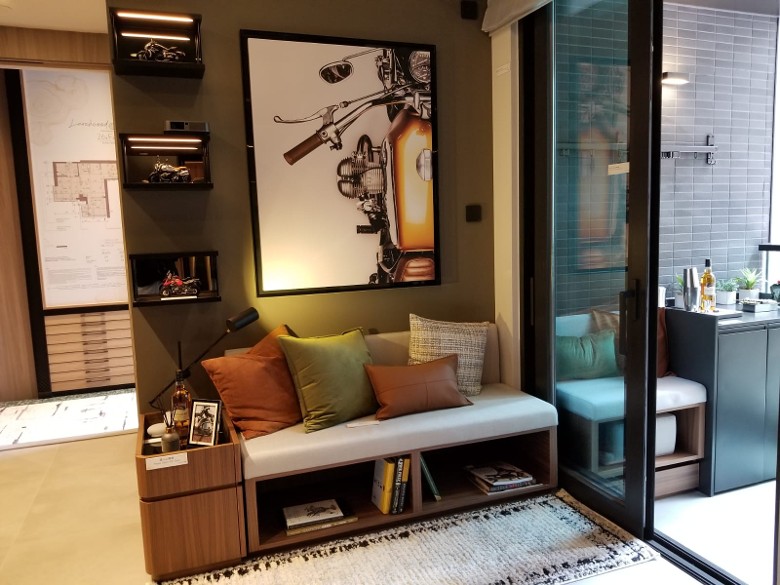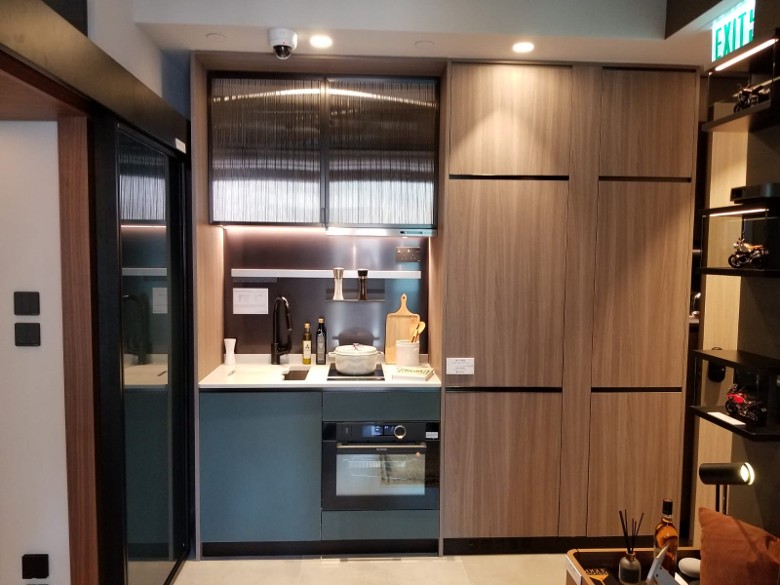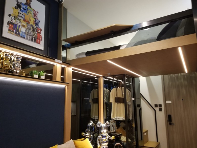 其中開放式示範單位參照22樓E室搭建,實用面積202方呎,附連22方呎露台,開放式廚房靠近窗戶,位於露台旁邊。單位樓層高度約3.5米,睡床設於閣樓,增加室內起居空間。