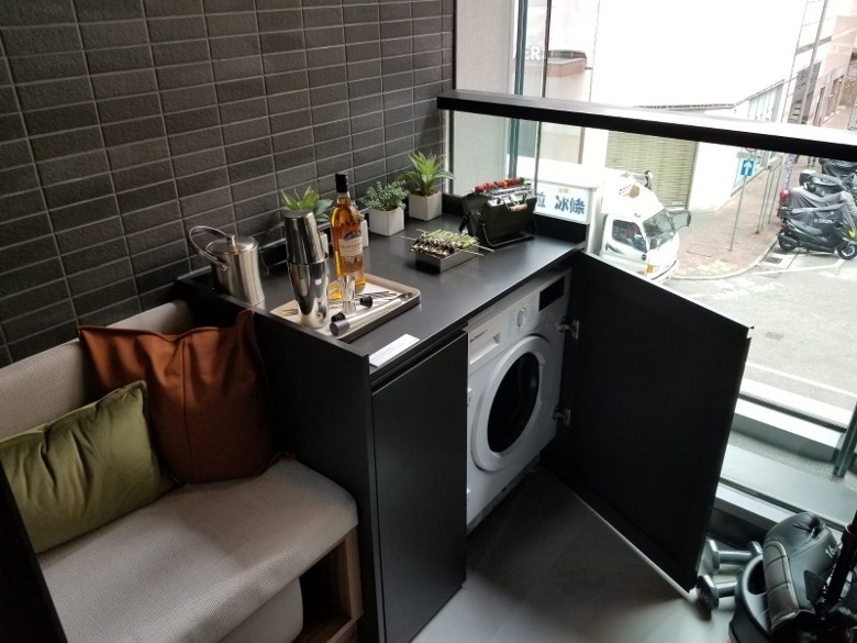 另一個單位以26樓F室為藍本,一房套房間隔,實用面積267方呎,同樣附有22方呎露台,露台放置洗衣機及餐飲空間,單位入口設有玄關,連接開放式廚房,睡房位置闢設閣樓,下層為飯廳及衣櫃,上層放置睡床。
