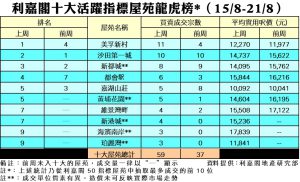 利嘉閣地產董事陳大偉表示,新盤競爭激烈,一眾向隅客轉往二手市場尋寶,而業主亦願意擴大議幅,促使十大屋苑交投量顯著增加。綜合利嘉閣地產分行數據所得,全港十大活躍指標屋苑在上周(15/8–21/8)錄59宗買賣個案,較前周(8/8–14/8)的37宗按周急增59%,每個屋苑平均錄近6宗成交。