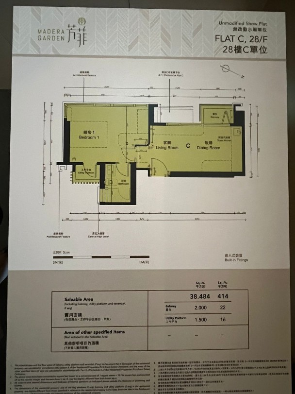 其中,連裝修無改動單位為28樓C室,實用面積414方呎,採一房間隔,客飯廳連接開放式廚房,外連22方呎露台。浴室設於睡房內,睡房連接16方呎工作平台。