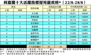 利嘉閣地產董事陳大偉表示,平價筍盤轉瞬即逝,整體業主未有跟隨「劈價」沽盤;另一方面,發展商頻推新盤吸收市場購買力,導致十大屋苑交投受壓。綜合利嘉閣地產分行數據所得,全港十大活躍指標屋苑在上周(22/8–28/8)錄35宗買賣個案,較前周(15/8–21/8)的45宗按周下跌22%,每個屋苑平均錄3至4宗成交。