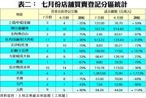 以地區劃分,在本行觀察的13個分區當中,共有10個地區的登記量按月下跌,當中以北角/炮台山區及荃灣區的75%跌幅最嚴峻,同告由前月的8宗減至上月的2宗。至於灣仔/銅鑼灣區及尖沙咀/佐敦區也雙雙樣錄得70%的跌幅,均由前月的10宗減少至上月的3宗買賣登記。不過,旺角/油麻地/大角咀區則逆市造好,月內勁錄17宗登記,除按月大升89%外,更一躍成為月內買賣最活躍的觀察區;而元朗區七月也升八成,共錄得9宗登記。