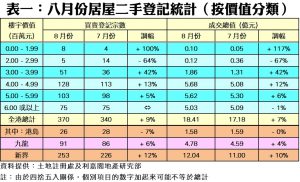 如按屋苑細分(見表二),八月份東涌裕東苑錄7宗買賣,按月大增6倍,而成交總值亦同步飆升近5.6倍至2,814.5萬元。至於屯門兆康苑及沙田愉翠苑,則均各以11宗買賣成為十大熱門居屋榜中交投量最活躍的屋苑。