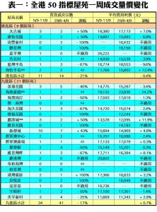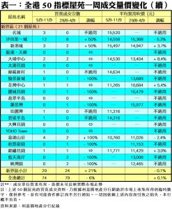 至於,新界區21個指標屋苑上周共錄29宗交投,較前周的24宗增加21%,當中嘉湖山莊期內共錄得4宗成交,按周大增1倍;沙田第一城及新港城則各自錄得12宗及3宗買賣,分別按周增50%。此外,在全港50個指標屋苑當中,上周共有19個屋苑錄得「零成交」,較前周的15個增加近27%,當中港島區佔2個;九龍區佔6個,而新界區則佔11個屋苑(詳見表一)。