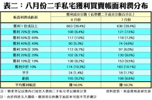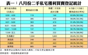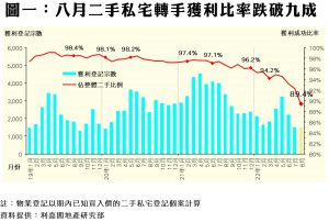 八月私宅轉手獲利率失守九成 12年半首見 今年累挫6.8百分點 金融海嘯後最駭人