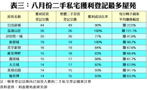 此外,環顧上月10個獲利登記最多的屋苑,當中達百分百獲利者由前月的6個大減至八月只有2個,而每宗平均賺幅則介乎最少的22.5%至最多的121.1%不等。當中嘉湖山莊成為錄得每宗轉手個案平均賺幅最高的屋苑,達逾1.21倍。至於上月榜內賺幅最低者為樓齡相對較低的日出康城,平均每宗只賺約22.5%,次低者為沙田第一城的41.8%(見表三)。
