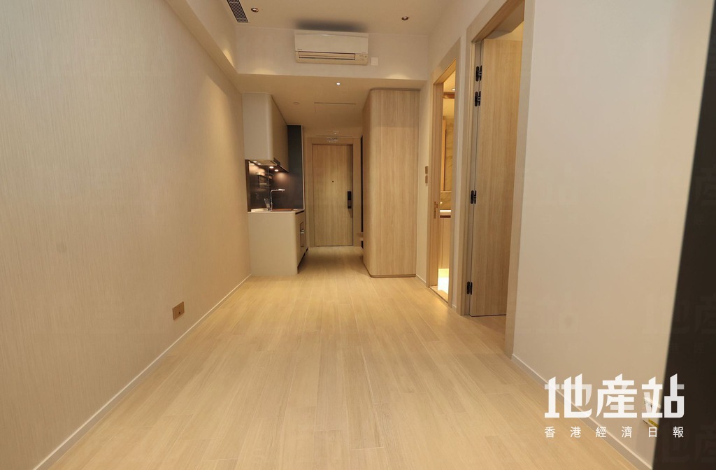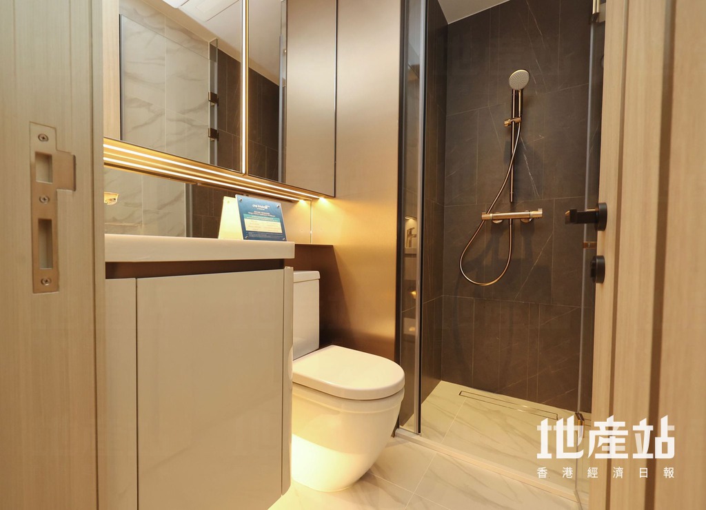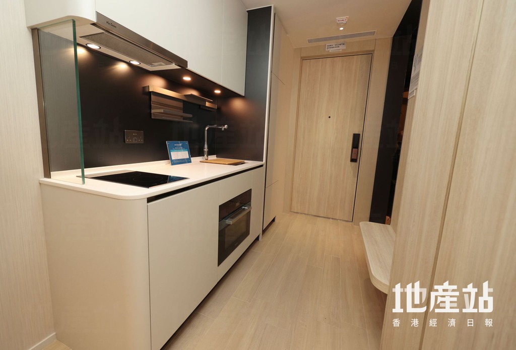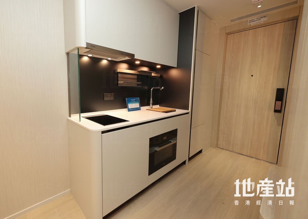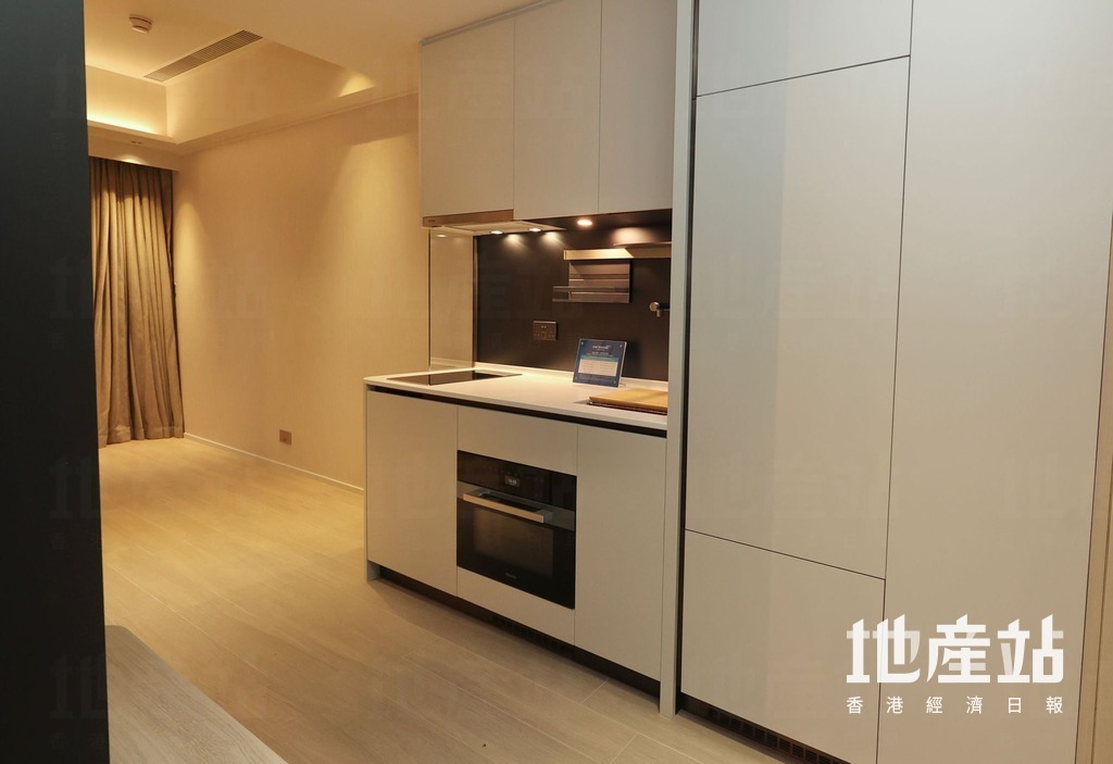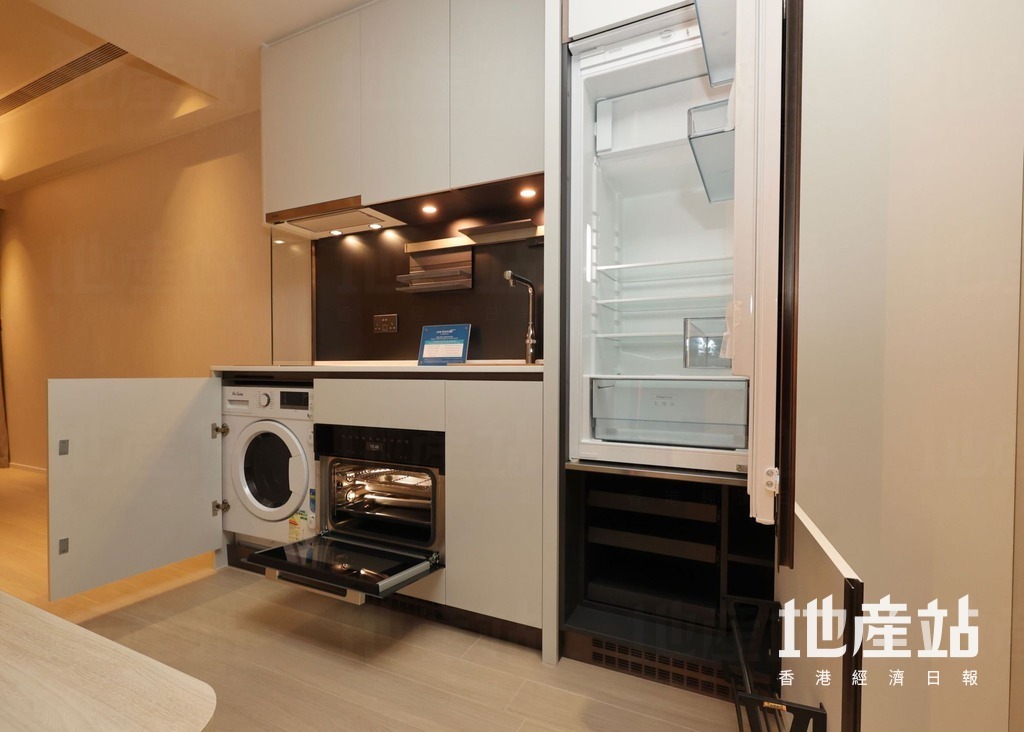 旁邊為開放式廚房,交樓標準配備基本家電,包括二合一洗衣乾衣機、電煮食爐、蒸焗爐及雪櫃。浴室採淋浴間設計,設有鏡櫃,增加儲物空間。