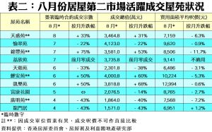 按物業價值劃分(見表一),八月份共有3個組別交投量按月下跌,當中價值400至500萬元以內組別交投跌幅最為顯著,由七月份的45宗買賣,跌至上月38宗,按月減少16%;最活躍的交投組別則為價值500至600萬元以內的居二單位,八月份共錄得41宗成交,較七月輕微回落5%。若按屋苑劃分(見表二),八月份將軍澳廣明苑及屯門龍門居均各錄4宗買賣,按月大減43%;而天水圍天盛苑則以8宗買賣成為上月最活躍的綠表居屋屋苑,成交宗數按月逆市上升33%;而沙田愉翠苑則以4,123萬元成為交投總值最高的居二屋苑,共錄7宗成交,反映新界區居屋亦深受綠表客追捧。