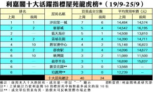 利嘉閣地產董事陳大偉表示,宏觀世界各國陸續開放關口吸引旅客到訪,本港疫情亦漸趨穩定,港府繼而宣布放寬入境檢疫限制,讓百廢待興的市場初見起色。綜合利嘉閣地產分行數據所得,全港十大活躍指標屋苑在上周(19/9–25/9)錄40宗買賣個案,較前周(12/9–18/9)的24宗按周上升67%,每個屋苑平均錄約4宗成交。