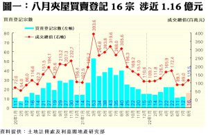 利嘉閣地產研究部主管陳海潮表示,大型新盤熱潮過後,有向隅客擔心利率上調影響置業部署,選擇回流二手市場尋覓心儀居所,夾屋買賣因而受惠。根據土地註冊處最新資料顯示,八月份夾屋買賣錄16宗登記,宗數較七月份的12宗增加33%,惟相比去年同期的40宗仍萎縮達六成。期內成交總值錄近1.16億元,重返億元水平,較七月份的8,904.8萬元上升30%;和去年八月近3.06億元相比則下挫約62%。