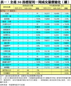 至於,新界區21個指標屋苑上周共錄47宗交投,較前周的48宗減少1宗或2%,當中麗城花園盈翠半島大興花園各自僅錄1宗交投,分別按周減少67%;珀麗灣期內錄得2宗買賣,按周減少33%;藍天海岸交投量由前周的5宗,減少20%至上周的4宗。此外,在全港50個指標屋苑當中,上周共有16個屋苑錄得「零成交」,較前周的14個增加14%,當中港島區佔5個、九龍區佔7個,而新界區則佔4個屋苑(詳見表一)。