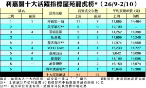 利嘉閣地產董事陳大偉表示,疫情逐漸緩和,政府公布實施「0+3」有效激活市場氣氛;加上金管局宣布放寬壓測要求,上車客權衡風險過後,旋即加快入市步伐。綜合利嘉閣地產分行數據所得,全港十大活躍指標屋苑在上周(26/9–2/10)錄51宗買賣個案,較前周(19/9–25/9)的32宗按周上升59%,每個屋苑平均錄約5宗成交。