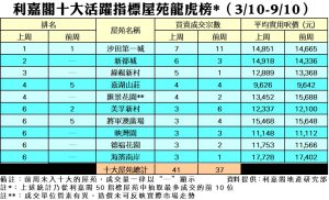 利嘉閣地產董事陳大偉表示,全城密切關注內地二十大會議及特首施政報告的消息,普遍市民對入市持觀望態度。在局勢發展未明之際,十大屋苑成交持續拉鋸橫行。綜合利嘉閣地產分行數據所得,全港十大活躍指標屋苑在上周(3/10–9/10)錄41宗買賣個案,較前周(26/9–2/10)的37宗按周上升11%,每個屋苑平均錄約4宗成交。