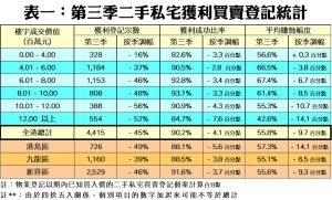 按物業轉售價格劃分,市場上大受追捧的樓價介乎801萬至1,000萬元組別之二手私宅轉售獲利比率高見93.1%,為表現最佳的組別,惟按季亦跌3.3個百分點,而其平均賺幅亦按季跌8.5個百分點,至61.4%。至於交投量最多,介乎401萬至600萬元以內細價物業獲利比率按季亦跌2.8個百分點至90.5%,而其平均賺幅按季也跌3.8個百分點,至66.5%。至於樓價介乎1,001萬至1,200萬元的物業,獲利比率達90.9%,惟平均賺幅則急挫10.7個百分點至僅有55.3%。