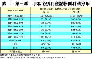 至於平均獲利幅度方面,今年第三季每宗私宅轉手個案平均賺幅只有55.8%,較第二季的65.5%顯著回落9.7個百分點,為25季以來首度跌穿六成水平,並創下2012年第三季以來的41季(即逾10年)新低,反映疫情引發的經濟憂慮令樓市走下坡,多了持貨期相對短的業主沽貨,因而導致整體賺幅劇降。當中,沽樓獲利1倍或以上的轉手個案佔整體二手私宅買賣比例跌穿四成,只達39.3%,按季下跌1.9個百分點,涉及宗數達1,923宗。此外,虧損個案錄得418宗,佔比急增至8.5%,相關比例按季增加3.4個百分點(詳見表二),反映股市下瀉及移民急走,令部分急需套現的業主無奈蝕讓離場;至於平手者則有63宗,佔比亦按季增至1.3%。