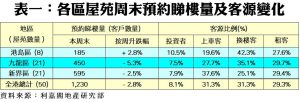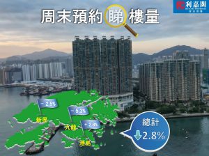 新界區方面,21個指標屋苑於本周末暫錄595組客戶預約睇樓,按周下跌2.5%。利嘉閣地產大圍區高級區域董事黃萬盛指出,沙田第一城「筍盤」持續稀缺,部分議幅較大的單位迅速被市場消化;加上特首即將發表施政報告,業主觀望政策動向而同時縮窄議價空間,買家睇樓意欲隨即驟降。黃萬盛補充,加息必然會對置業者構成一定心理影響,在業主未肯擴大議幅應市下,相信短期內二手拉鋸情況持續。