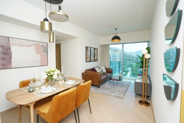 最新開放的現樓單位為第8A座12樓A室,實用面積674方呎,向東。單位布置以啡木色配金鉉色為主調,樓層與樓層之間有約3米高。客飯廳長約6.2米、寬約2.8米,設有落地玻璃趟門連接31方呎露台,外望翠綠景色。
