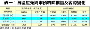 按地區劃分,港島、九龍及新界三區指標屋苑的周末預約睇樓量全線下跌,其中以新界跌幅較大,該區21個指標屋苑本周末暫錄575組客戶預約睇樓,按周減少3.4%。利嘉閣地產昇薈分行高級分區董事關騰達指出,少數急讓業主議幅較大,當中映灣園於淡市中突圍而出,本月至今錄10宗成交。關騰達補充,施政報告中專才置業計劃對樓市即時影響有限,市場上觀望氛圍依然濃厚,因此本周末睇樓人流較為疏落。