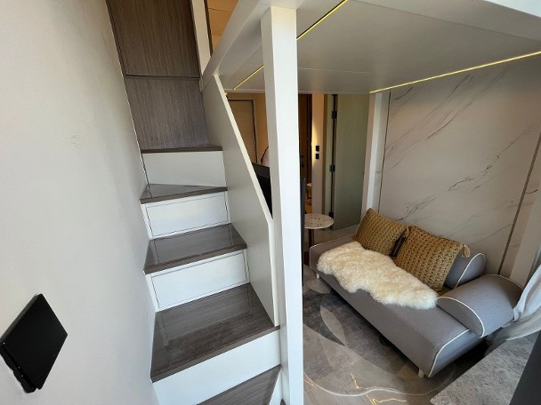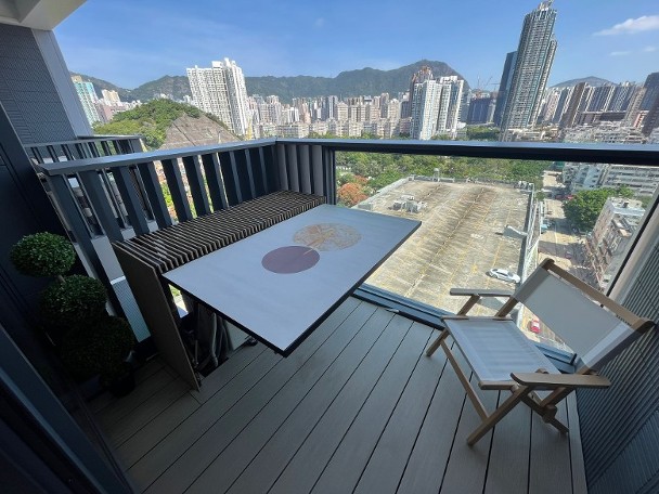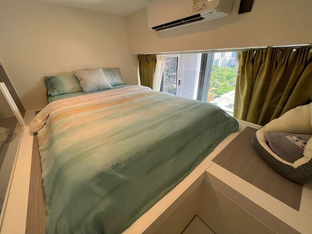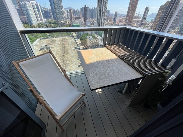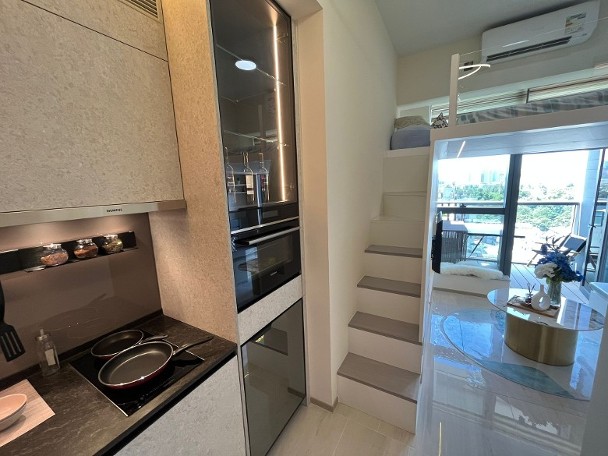 其中,12樓B室屬於連家具的開放式單位,實用面積213方呎,採用北歐風格布置,層與層之間的高度約3.45米,利用家具打造垂直空間,以分隔客廳區及寢區,下層擺放梳化,外連38方呎的露台,上層則放有睡床。廚房採開放式設計,附連展開式櫥櫃餐枱。
