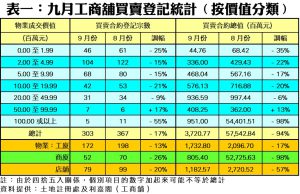 商廈買賣登記量跌勢持續,連跌4個月並創近半年新低;九月份商廈買賣登記只有52宗,按月再挫26%,為三類物業中跌幅最大者。當中登記量跌幅集中在細價商廈,其中200萬元以下者,九月份大減70%至只有3宗登記;而200萬至500萬元以內者亦下跌41%至17宗,反映細價商廈入市步伐亦見轉慢。此外,月內商廈買賣登記總額急挫98%,至只有8.05億元,主要涉及前述巨額登記拉高前月基數使然。