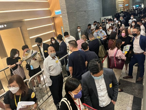 是日銷售會分兩輪時段揀樓,優先的A組買家須購買一個複式單位或一個三房單位、或兩伙指定單位。現場所見,A組準買家於下午約3時起陸續到場,排隊輪候進入售樓處。B組準買家隨後亦陸續入場。