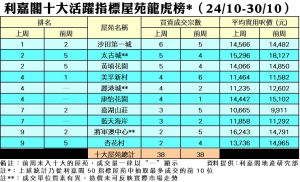 利嘉閣地產董事陳大偉表示,業主議價空間開始收窄,加上發展商提速推售新盤,搶佔市場焦點,導致二手屋苑交投停滯不前。綜合利嘉閣地產分行數據所得,全港十大活躍指標屋苑在上周(24/10–30/10)錄38宗買賣個案,與前周(17/10–23/10)的38宗持平,每個屋苑平均錄約3至4宗成交。