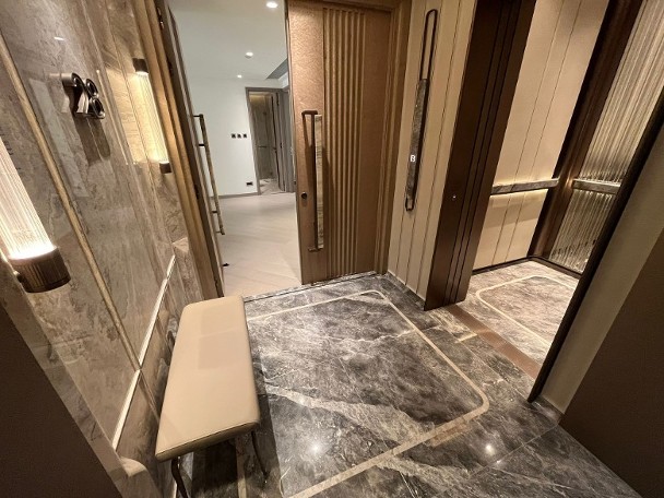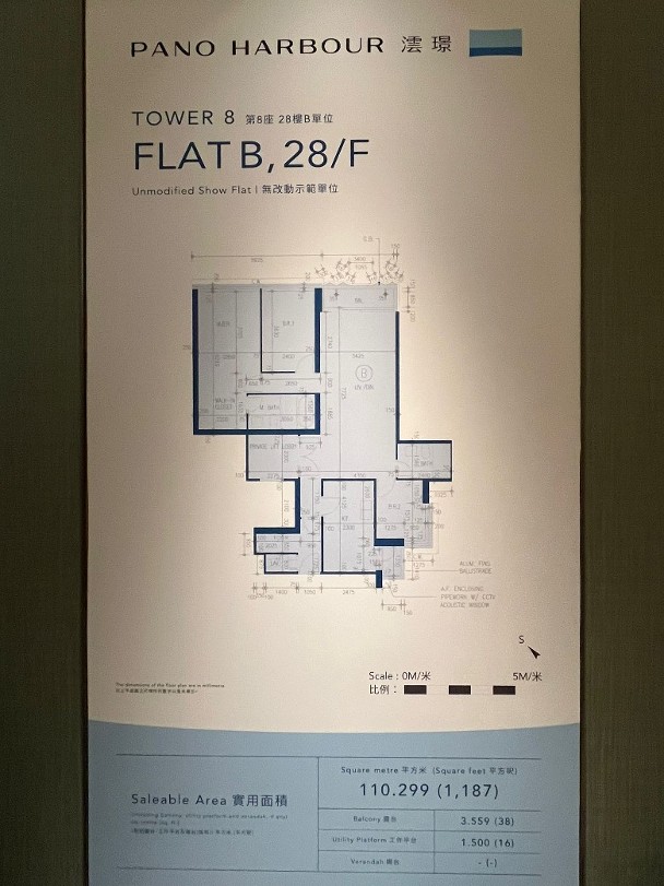 此外,三房無改動示範單位參照第8座28樓B室,實用面積1,187方呎。單位設有私人升降機大堂,客飯廳空間寬闊,長約7.7米、闊約3.4米,外連38方呎露台。