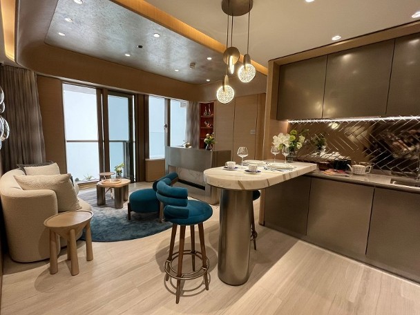 其中,上述經改動連家具示範單位參照第3B座28樓C室搭建,實用面積568方呎。單位原則為兩房間隔,設計師將連接客廳的其中一個睡房打通,擴闊整體客飯廳空間,除了擺放梳化之外,亦放置書枱。客飯廳附連開放式廚房,並延伸出一張吧枱,可作餐桌使用。