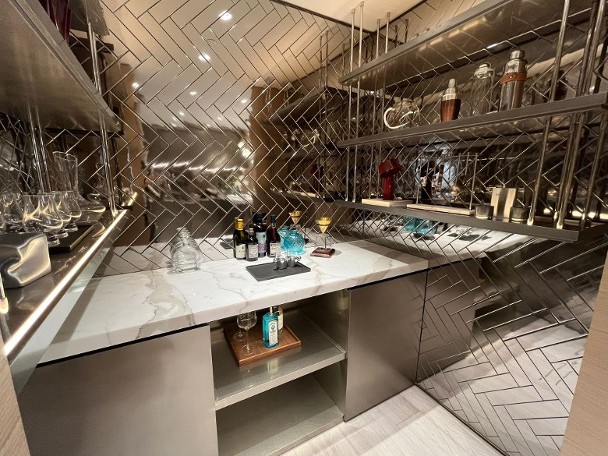 同時,設計師將門口左方的儲物室,改裝成品酒區域。至於主人睡房則設有16方呎工作平台,房內放置雙人睡床後,仍有不少走動空間。