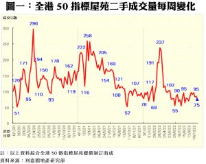 利嘉閣地產董事陳大偉表示,本港主要銀行上調最優惠利率0.25厘,準買家希望樓價再減以抵銷加息影響,惟業主則認為價格已經經過一段時間的調整,再大幅減價的空間不大,買賣雙方呈拉鋸狀態,令二手屋苑交投量受壓。綜合利嘉閣地產分行數據所得,全港50個指標屋苑於上周(31/10—6/11)共錄75宗買賣個案,較前周(24/10—30/10)的85宗減少12%,創七周以來新低。