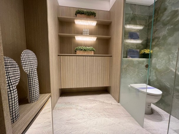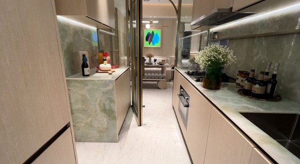 該單位室內設計以大地色系為主調,牆身選用淺色木紋飾面,配以象牙白色磚材鋪砌地板。單位玄關位置裝有鏡,客飯廳涇渭分明,廚房採梗廚設計,設有雙邊工作枱,並外連18方呎工作平台,而連廁儲物室亦設於廚房內。