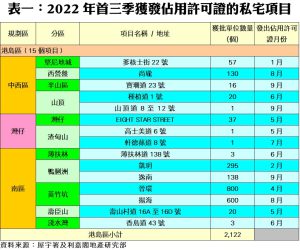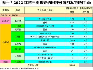 利嘉閣地產研究部主管陳海潮表示,根據屋宇署今天最新發表的資料月報顯示,2022年九月份全港共有9個項目,合共2,672個私人住宅單位落成(以屋宇署發出佔用許可證的樓宇數量為準),較八月份的730伙急增近2.7倍,創七個月新高;今年第三季合共4,533伙私宅落成,按季增加近14%。至於,今年首三季合共47個項目、涉及16,597伙私宅落成,較去年同期的11,169伙按年增加近49%,是自2005年以來的十八年同期最多。